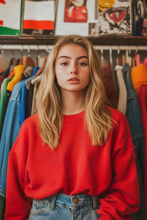 Young Gen Z person in vintage thrift store, sustainable fashion choices in a colorful wardrobe.