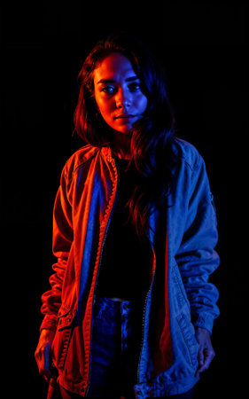 photo of beautiful woman with mixed red and blue lighting , generative AI