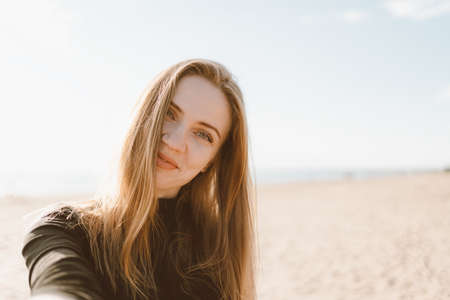 Pretty female with long hair, blonde takes selfie photo on mobile phone. Beautiful woman looking at camera and tilting head. Sandy beach in unny day in ocean or sea coastline