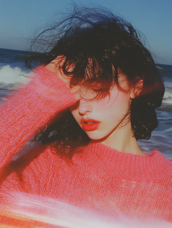 Young girl, wearing casual clothes, photographed on the beach in winter.