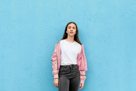 Portrait of pretty caucasian teen girl in plain white t-shirt and pastel pink bomber jacket standing against blue city wall solid background. Monochrome, fashion minimal, urban style, mockup concept.