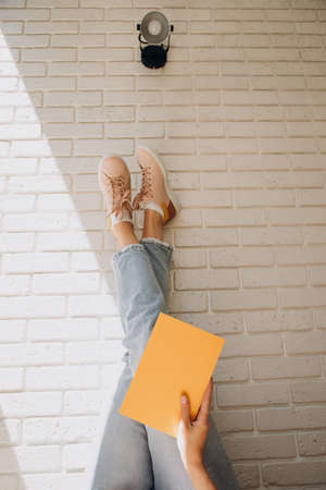 Woman holding a yellow notebook with her legs up in blue jeans and pink sneakers against a brick wall background