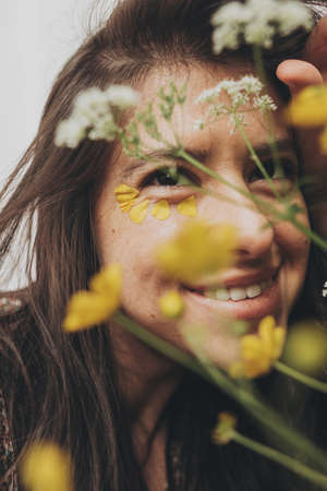Beautiful happy woman with yellow petals under eyes posing with wildflowers in sunny room. Portrait of young brunette female in boho dress smiling with flowers. Skin care and self care. Summer mood