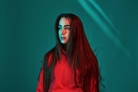 Teen in the studio indoors with neon light. Portrait of beautiful young girl.