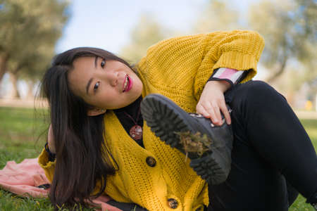 pretty Asian woman in city park - lifestyle portrait of young beautiful and happy Chinese girl sitting on green grass cheerful and relaxed enjoying free time outdoors