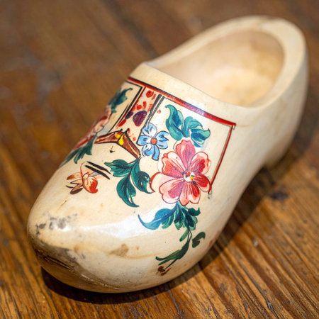 A single, hand-painted Dutch wooden shoe rests on a rustic table, its floral folk art telling a story of tradition and heritage.