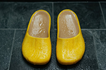 pair of traditional Dutch yellow wooden shoes on a stone footpath