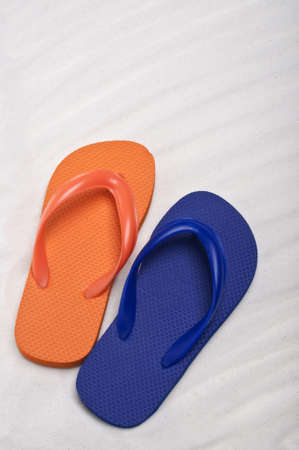 Summer Flip Flop Sandals on a Sand Background.