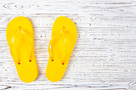 yellow rubber slippers on a white wooden background, view from above, place under the text