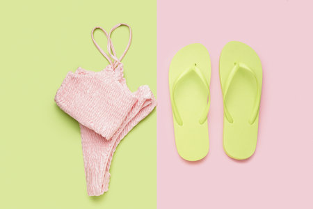 Green flip-flops with pink swimsuit on color background