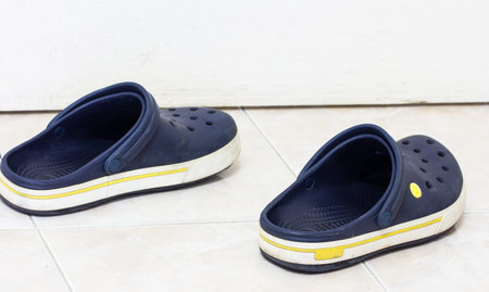 Summer rubber shoes on bright yellow wooden planks