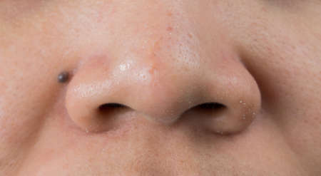 Blackheads acne on Asian woman nose. Scar on tip of nose. Open comedones and large pores skin need AHA, BHA or benzoyl peroxide for treatment.
