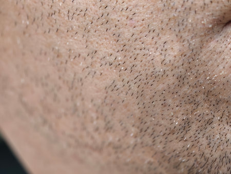 The skin of the man's face with stubble and flaky skin, sparse, gray hairs in the beard.