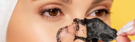 close up view of woman removing blackheads on nose isolated on yellow, panoramic shot