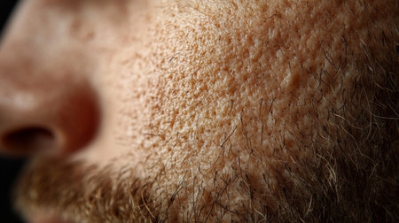 Close-up of textured facial skin highlighting fine hairs on a mans face in a dimly lit environment for detailed study. Generative AI