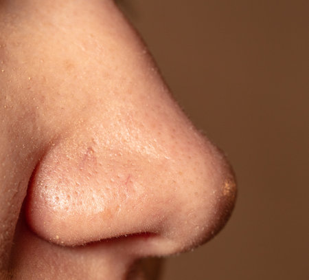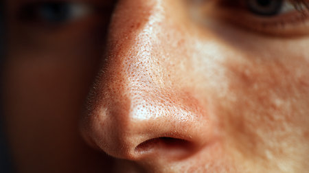 Close-up view of a nose with moisture on the skin surface