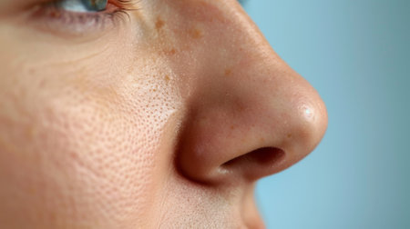 Close up of a womans nose highlighting blackheads, emphasizing the need for cosmetic treatment or skincare routines to achieve clear and healthy skin