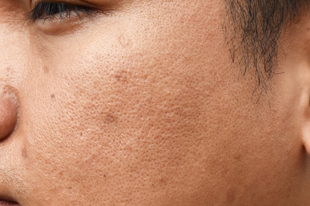 Close-up of problem skin with deep acne scars on a young man's cheek