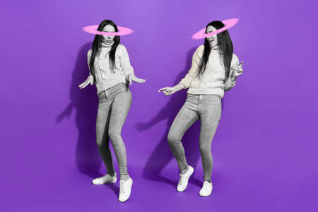 Composite collage picture of two people same black white filter have fun dancing isolated on purple color background