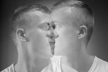 Conceptual portrait with man surrounded by his multiple personalities. Depressed person with multiple personality disorder
