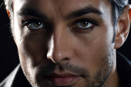 A confident man showcases enhanced facial features, exuding admiration and reflection in his thoughtful gaze. Perfect for themes of self-assurance and charisma.