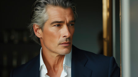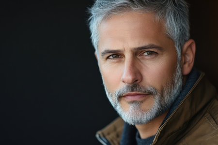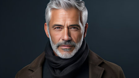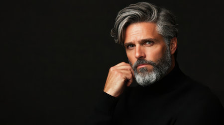 This captivating portrait features a mature man with striking silver hair and a confident gaze, set against a dark background, showcasing timeless masculinity.