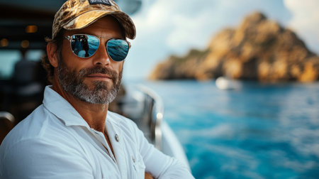 A man stands confidently on a yacht, arms crossed, wearing sunglasses and a cap. The serene sea and rocky mountains create a tranquil backdrop under clear blue skies.