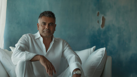 A contemplative man showcases his striking features while relaxing indoors.
