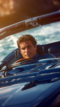 Portrait of a handsome young man driving convertible car on the beach