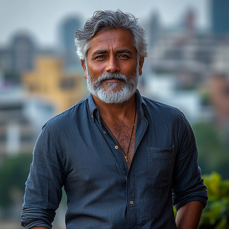 Portrait of a handsome Indian man with gray beard and mustache.