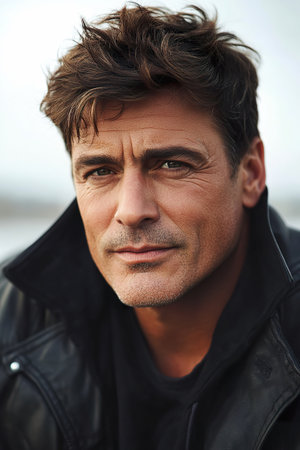 Confident French man with tousled hair wears black jacket against cloudy backdrop by coastline.