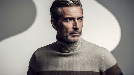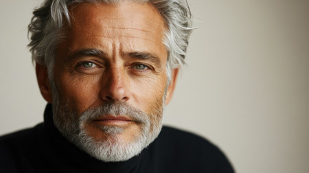 A portrait of a handsome mature man with grey hair and a beard, wearing a beige turtleneck sweater. He looks confidently away from the camera against a neutral abstract background, embodying style and sophistication.