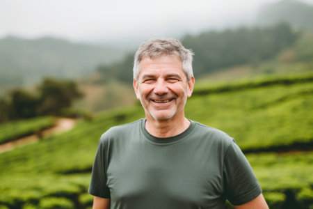 Portrait of smiling mature man standing in tea plantation on foggy day
