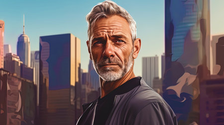 Serious middle-aged man with folded arms and a deadpan expression posing in front of background. Man portrait illustration. Generative AI art