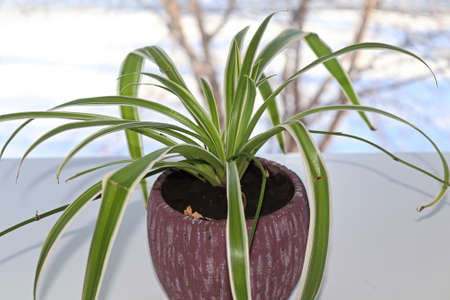 Spider Plant (Chlorophytum) in white ceramic flowerpot standing on windowsill - relax time