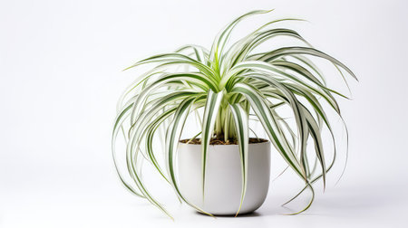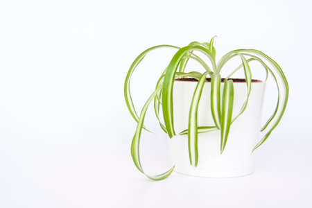 Spider plant (Chlorophytum comosum) in Flowerpot Isolated, Spider House Plant in Flowerpot on White Background, Copy Space