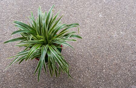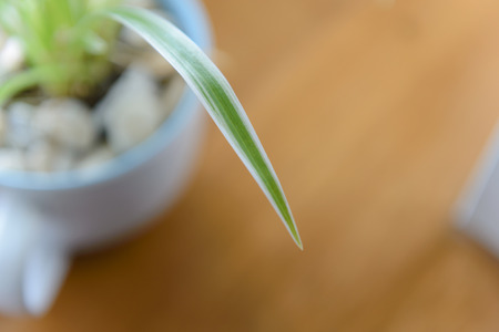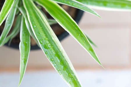 Closeup leaves of spider plant or Chlorophytum comosum in pot with water drop, Top view