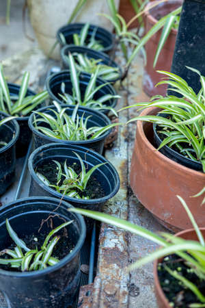 Lush green spider plants in pots with variegated leaves.