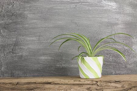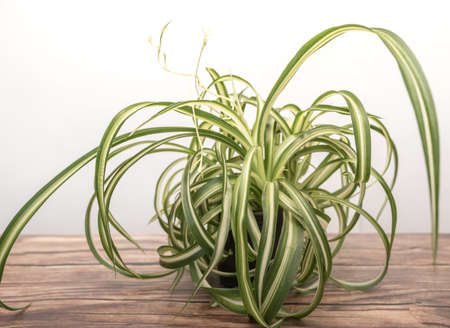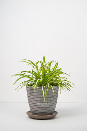 House plant Chlorophytum comosum in grey pot on white table.