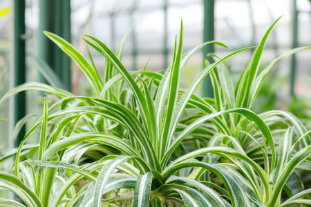 Fresh green spider plants with vibrant leaves flourish in a well lit greenhouse setting showcasing healthy growth and vibrant colors.