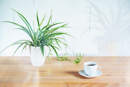 Coffee cup and potted green plant on a wooden table, blurry shadow on the white painted wall in industrial style, architecture background, colored glare effect overlay, copy space, selected focus
