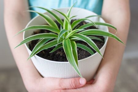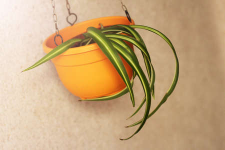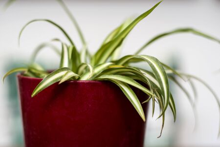 Close up view of indoor chlorophytum plant planted in a ceramic pot. Concept of botany, home interior, plant growing