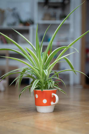 Chlorophytum in a red mug on the floor
