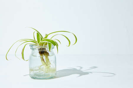 Reproduction, rooting of room flowers. Chlorophytum with roots in a glass of water