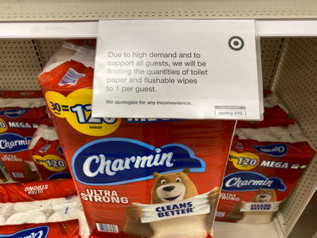 Eau Claire, Wisconsin - March 30, 2020: Toilet paper (Charmin brand shown) is nearly out of stock at a Target store due to the Coronavirus COVID-19 Pandemic