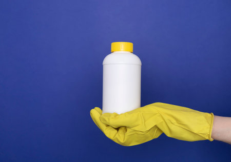 A hand in a yellow glove holds a white bottle of detergent on a blue background. Banner with copy space. Chemical cleaners, household chemicals, brushes and collage supplies.