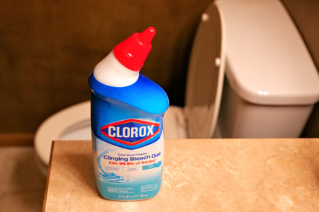 BEMIDJI, MN - 30 JAN 2021: Clorox Toilet Bowl Cleaner in a plastic container on a counter, next to a bathroom toilet. Clinging Bleach Gel Kills Germs is stated on the bottle.