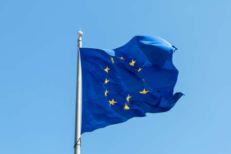 Flag of the European Union isolated on a clear blue sky waving on the wind