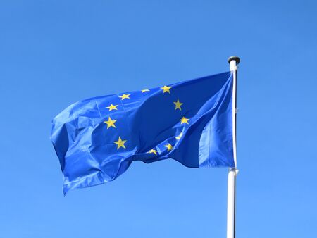 European flag in the wind with a beautiful blue sky in the background. Place to place text