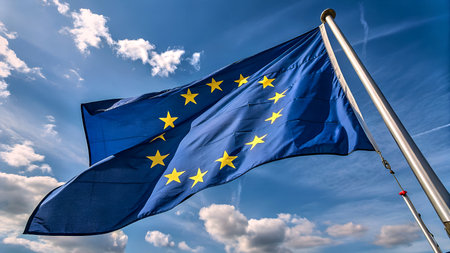 The European Union flag flutters steadily in the wind under a bright blue sky, showing its vibrant colors and iconic stars.